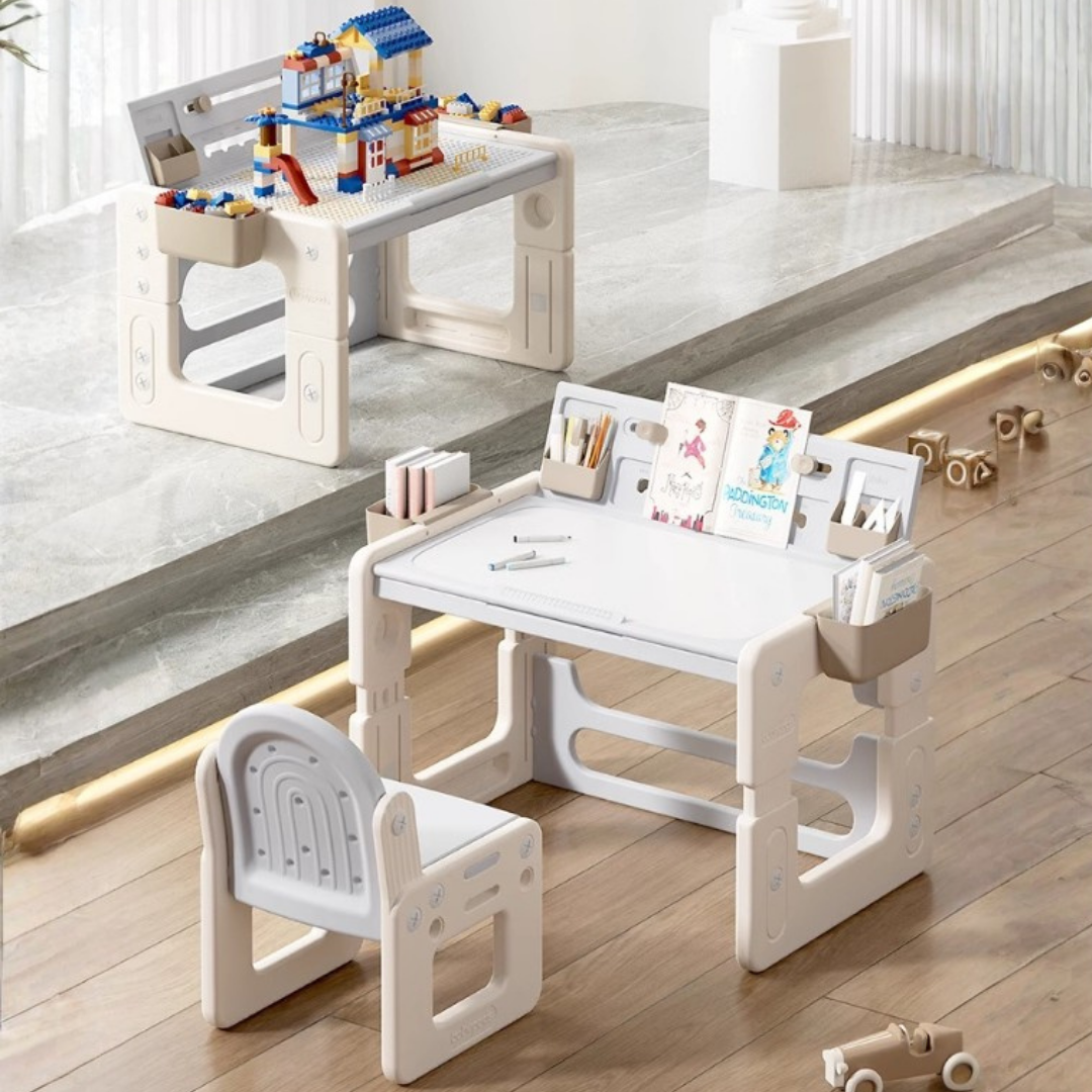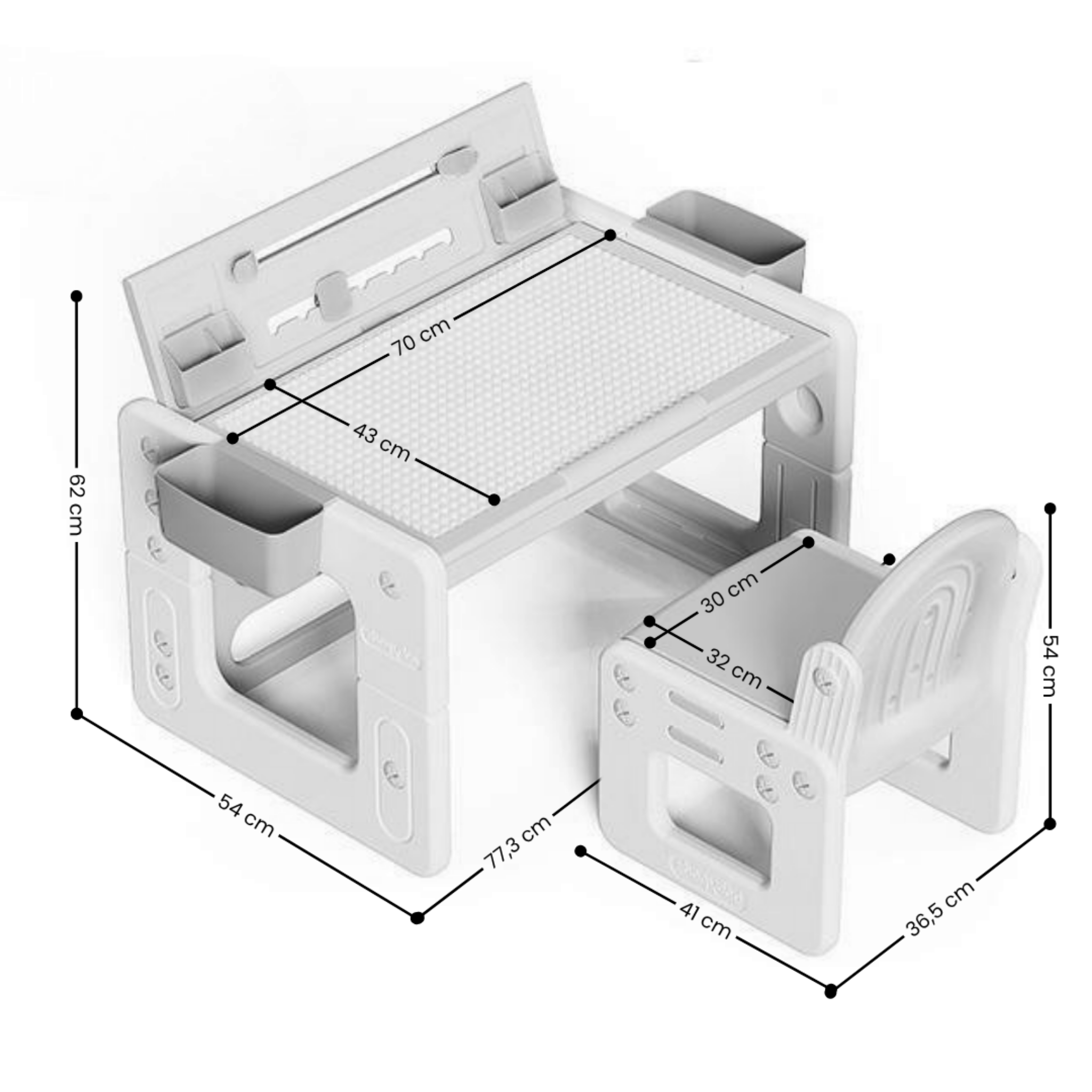 Zestaw doskonale odnajdzie się w codziennym życiu Twojego dziecka. Może służyć jako miejsce do oglądania bajek, nauki pierwszych literek, tworzenia kreatywnych prac plastycznych, a także do spożywania posiłków. Dzięki kompaktowym wymiarom i lekkiej konstrukcji można go łatwo przenosić w dowolne miejsce – z pokoju do kuchni, na balkon czy do ogrodu. To uniwersalne rozwiązanie, które dostosowuje się do potrzeb i rytmu dnia dziecka. Możliwość wymiany blatu na ten dedykowany dla klocków, zapewni twojemu dziecku zabawę na długi czas!