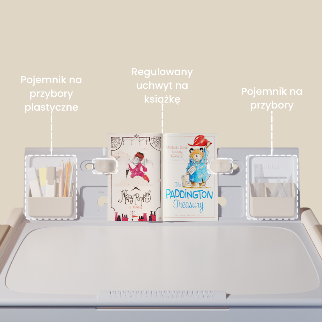 Blat stolika wyposażony jest w funkcjonalną podpórkę, która znacząco ułatwi dziecku organizację i zachowanie porządku.
